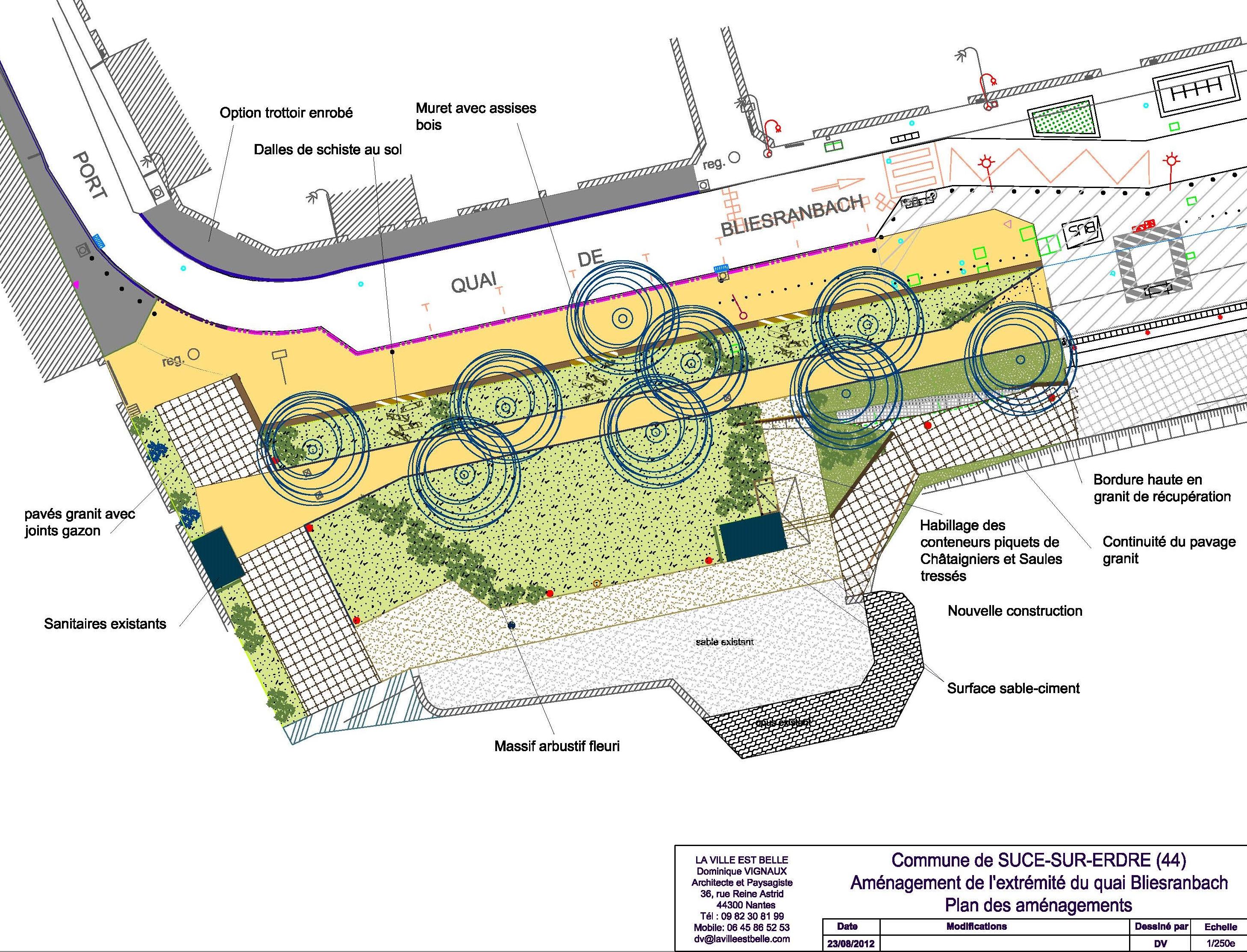 Étude de conception de l’aménagement de l’extrémité du Quai Bliesranbach, quai de l’Erdre dans le centre de Sucé-sur-Erdre, dans l’objectif de développer attractivité touristique et de rendre ce lieu accessible à tous.